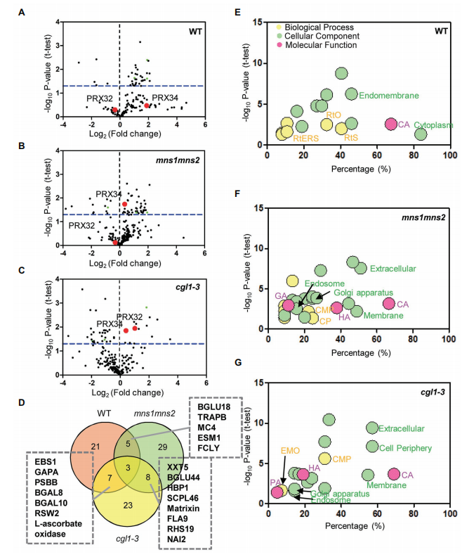 文中進一步分析了鹽脅迫下DAG在GO注釋和KEGG代謝途徑中的生物學功能。在兩個突變體中觀察到更多減少的糖蛋白,尤其是在cgl1-3中(圖2?A–C)。值得注意的是,與?WT?相比,?mns1?mns2和cgl1-3突變體中的水解酶均得到富集(圖2?D–F)。在鹽脅迫下,WT和兩個參與內質網聚糖鏈轉移的突變體中?STT3A(OST亞基)、紫色酸性磷酸酶?2(PAP2)和類胚蛋白10(GLP10)的豐度發生了變化,這些蛋白分別參與了根系生長和碳代謝(圖2?D)。STT3A在?WT中增加,但在mns1?mns2和cgl1-3中減少;PAP2?在?WT?和mns1mns2中增加,但在cgl1-3中減少,并且GLP10在所有三個樣本中都增加。進一步的分子功能分析發現,與WT相比,水解酶活性在mns1?mns2和cgl1-3中富集(圖2?E,G)。WT中鑒定的蛋白質的生物學過程多與應激反應相關,而來自突變體的大多數DAG與碳水化合物代謝過程有關(圖3?G)。這些結果表明,mns1?mns2和cgl1-3突變體中的鹽響應糖蛋白不能正確響應壓力,這可能是由于缺乏正確的N-聚糖修飾,導致它們的亞細胞定位異常。