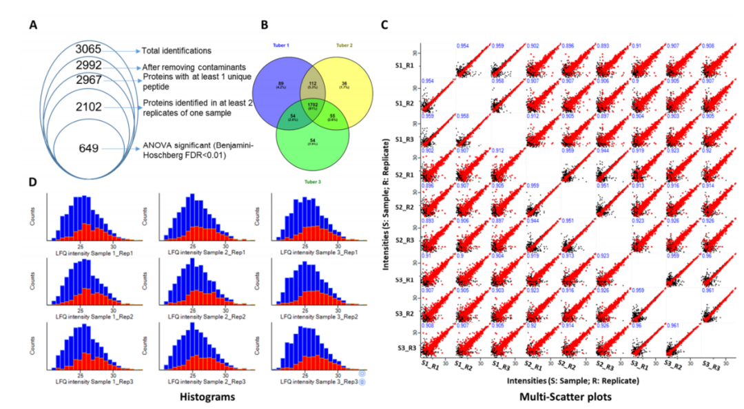 維恩圖分析顯示1702個蛋白質組通常在所有三個塊莖樣品中鑒定,而89、36和54個蛋白質組分別僅在塊莖?1、2和3中鑒定。此外,塊莖?1?和塊莖?2?共有?112?個蛋白質組,表明它們的蛋白質組與塊莖對?(2,3)?和?(3,1)?相比更密切相關(圖1?B)。為了檢查同一樣品一式三份中無標記蛋白質定量的重現性,使用?Perseus軟件生成多散點圖(圖1?C)。相同樣本的散點圖顯示出典型的非均勻分布,即在較低強度時較寬,在較高強度時指向較高。同一樣品的不同重復的皮爾遜相關系數大于0.944,表明同一樣品的三次重復之間具有高度相關性。直方圖顯示了缺失值插補前后的蛋白質計數?(圖1?D)。