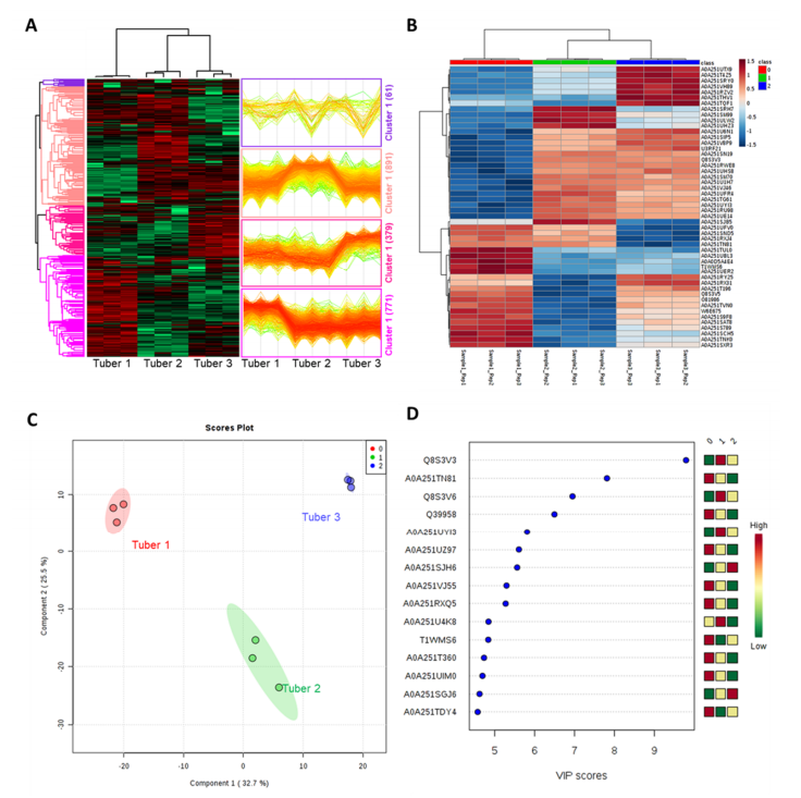 層次聚類分析將差異蛋白分成四個簇,每個簇都有不同的表達譜(圖2?A)。簇1包含61種蛋白質,在塊莖3中主要下調,而簇1的891種蛋白質主要在塊莖2中上調。簇3顯示塊莖3中豐度增加的379種蛋白質,而簇4中的771種蛋白質在塊莖?1?中顯示最大豐度。顯示前48種差異調節蛋白質豐度模式的熱圖位于?(圖2?B)。在這48個DEs中鑒定了多種具有獨特功能的蛋白質。共有19、24和34種DE蛋白受到高度調節,而塊莖1-3中分別有27、22和14種蛋白質降低。結果表明,塊莖?1?和塊?3?的蛋白質含量非常不同,而塊莖2的結果則參差不齊。此外,偏最小二乘判別分析?(PLS-DA)?將成分?1?中的塊莖1和3分開,占總方差的32.7%,而成分2中的塊莖2與塊莖1和3分開,占總方差的?25.5%總方差的百分比?(圖2?C)。最后確定了有助于PLS-DA圖分離的前15種蛋白質(圖2?D)。