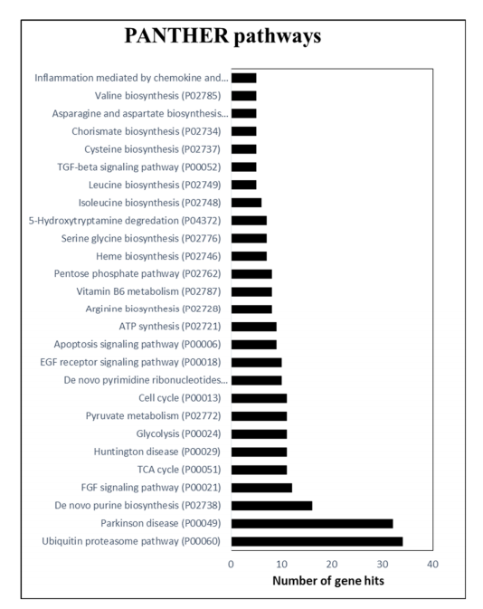 統計分析后,作者進行基于基因本體(GO)的功能分類,在2102種蛋白質中,PANTHER?19.0?針對Helianthus?annus數據庫檢測到2044種蛋白質。接下來,進行?PANTHER?通路分析以對蛋白質通路進行分類,發現了大多數蛋白質歸因于泛素蛋白體和核苷酸(嘌呤)生物合成途徑,其次是TCA循環、糖酵解、丙酮酸代謝、細胞周期和嘧啶核糖核苷酸途徑。