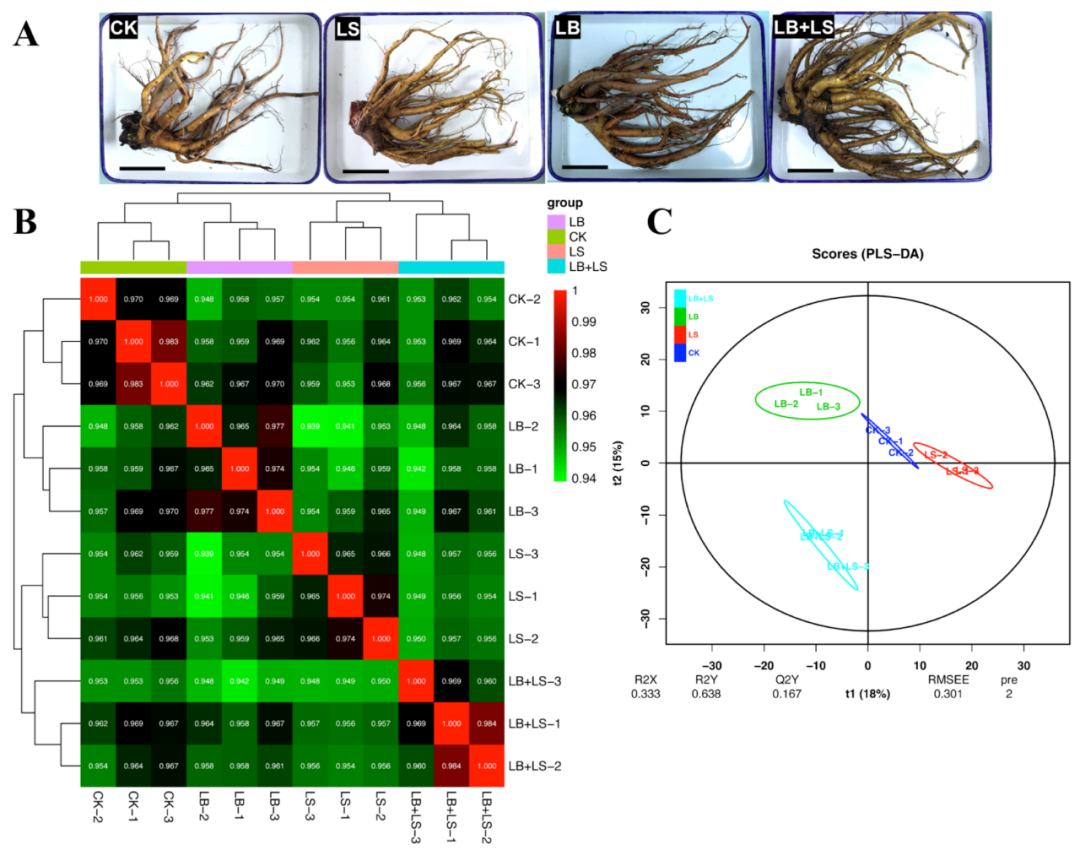 在收獲時,還確定了地塊產量的變化(圖2)。與兩個明顯的倒V形趨勢的生長結果一致,LB + LS和LB + MS處理下的R. palmatum?L.根的鮮重得到了最顯著的改善(圖2A)。我們進一步分析了主根和側根的變化(圖2B-D),發現在LB+MS下獲得最大的根長和側根數,而在LB+LS下獲得最大的主根直徑,這意味著 LB + MS處理刺激側根的數量和長度,而LB + LS促進主根厚度以提高R. palmatum?L.的根重。