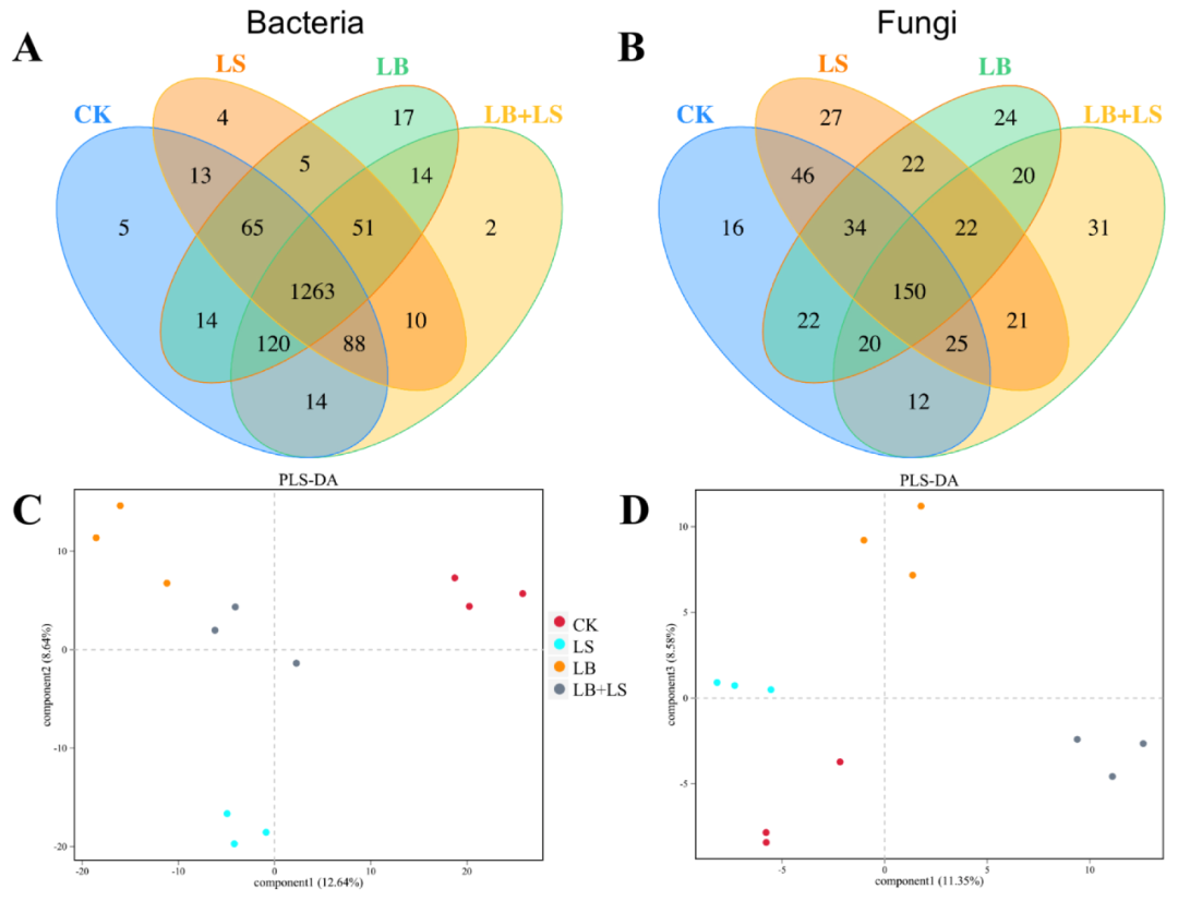 生成了基于16S rRNA 基因的細菌測序和基于ITS rRNA 基因的真菌測序圖譜,以更好地揭示大黃根際的微生物群落組成。使用 97%的核苷酸序列同一性,將這些序列分為1685個細菌OTU和492個真菌OTU,其中CK根際細菌OTU豐度最高(1582),其次是LB + LS(1562)、LB(1549)、和LS (1499)處理,而LS根際的真菌OTU數量(347)最高,其次是CK (325)、LB (314) 和LB + LS (301) 處理(圖6A,B)。維恩圖表明CK、LS、LB和LB + LS處理分別有5、4、17 和 2 個共享的OTU,在細菌群落中共有1263個OTU。在真菌群落中,CK、LS、LB和LB + LS處理分別有16、27、24和31個OTU,共享了150個OTU(圖6A,B)。