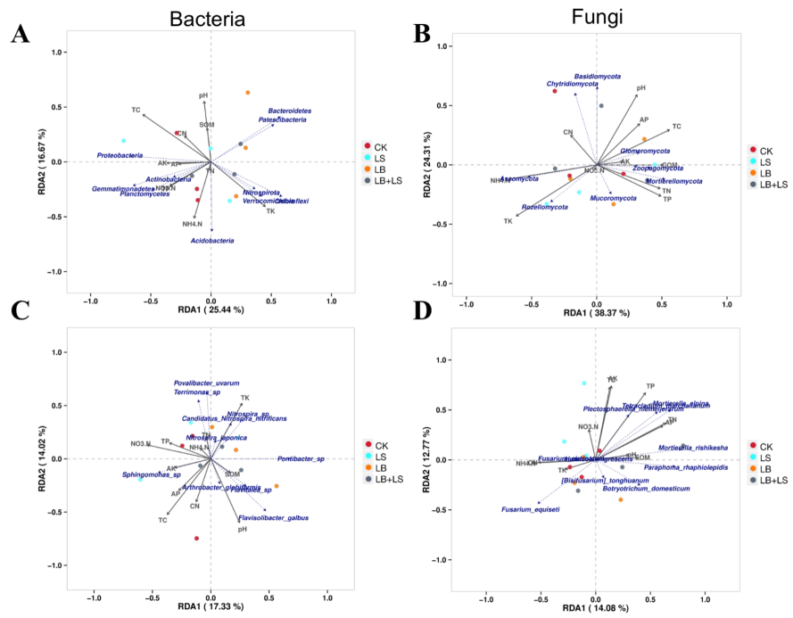 對于門水平的真菌,總群落組成與以下土壤理化性質密切相關:TK、NH4-N、TC、pH和TP(圖8B)。LS土壤以Rozellomycota和Mortierellomycota為主,其成員與TK和TP相關性最高,LB處理的土壤以Mortierellomycota、Zoopagomycota和Mucoromycota為主,與 TP、TN和SOM相關性最高,以及LB + LS土壤以Basidiomycota和Chytridiomycota為主,它們與土壤pH和C/N有關。