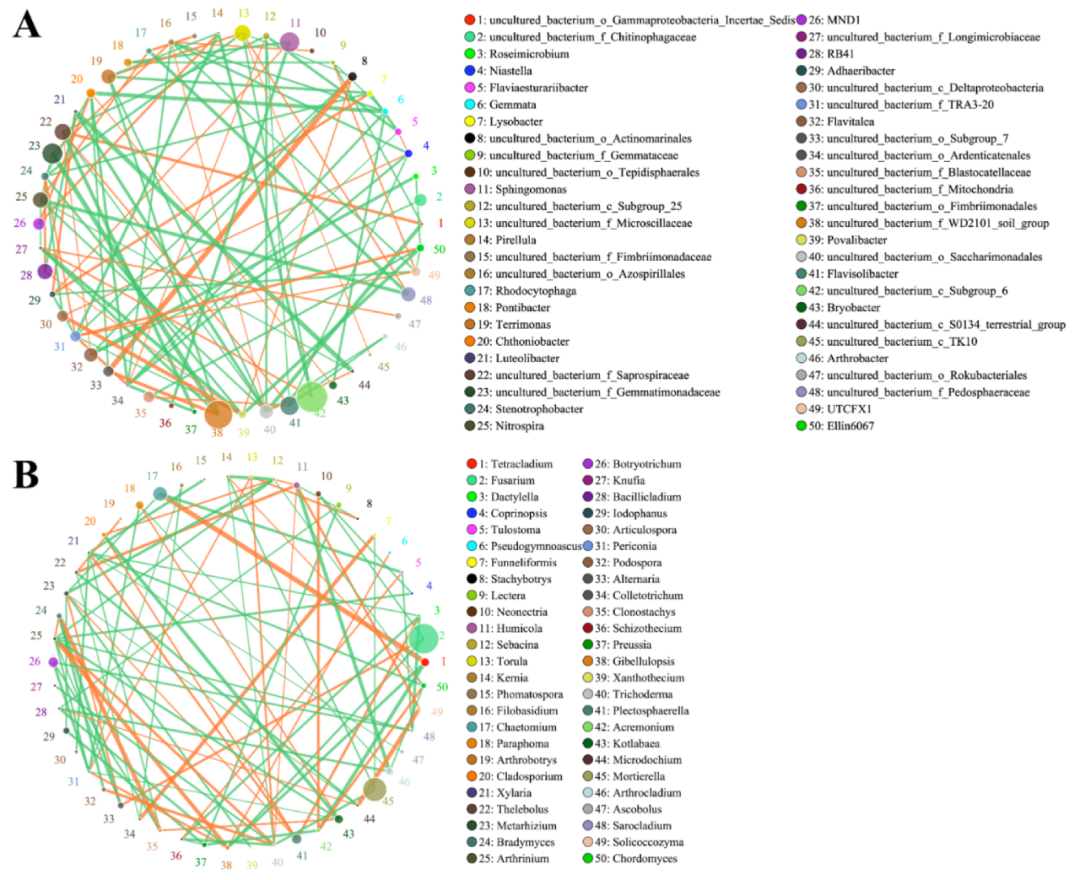 對最豐富的屬之間的Spearman相關系數進行網絡分析(圖9),顯示出50個主要細菌和真菌屬之間的相關性。