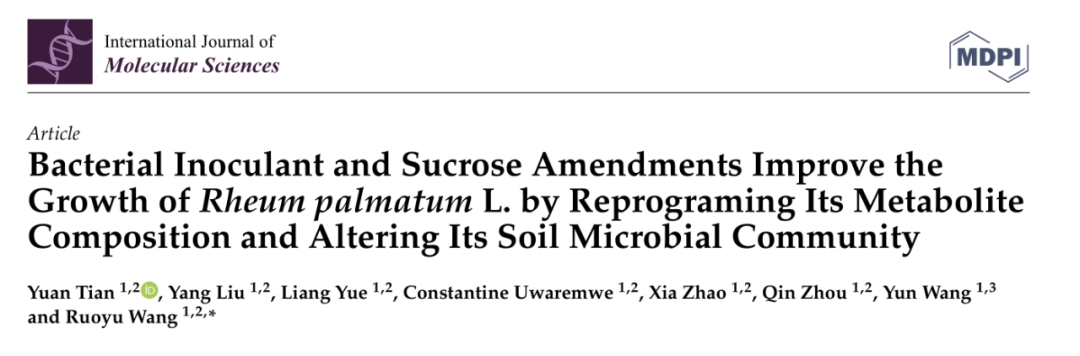2022年2月,中國科學院西北生態環境與資源研究所在《International Journal of Molecular Science》發表題為“Bacterial Inoculant and Sucrose Amendments Improve the Growth of?Rheum palmatum?L. by Reprograming Its Metabolite Composition and Altering Its Soil Microbial Community”的研究論文,該論文主要研究了(1)細菌接種劑和蔗糖聯合使用對R. palmatum?L.的影響;(2)聯合接種對土壤性質和土壤微生物的影響;(3)聯合接種后根際微生物變化及其與R. palmatum?L.生長變化的關聯。