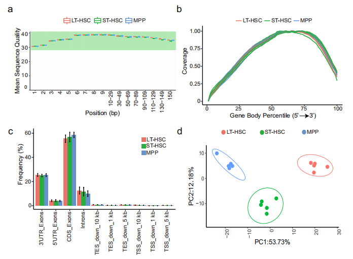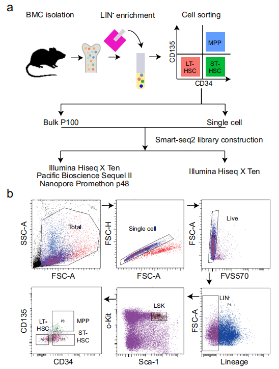 樣本制備:8-9周的雌性成年C57BL/6 J 小鼠,從股骨和脛骨中分離骨髓細(xì)胞。首先使用小鼠造血干細(xì)胞分離試劑盒富集造血干細(xì)胞和祖細(xì)胞(HSPC)。長期(LT)和短期(ST)造血干細(xì)胞(HSC)和多能祖細(xì)胞(MPP)根據(jù)其表面標(biāo)志物進(jìn)行分選。對(duì)于單細(xì)胞RNA測序(scRNA-seq),將細(xì)胞單獨(dú)分選到含有裂解緩沖液的8條PCR管中。同時(shí)對(duì)于批量RNA-seq,分選100個(gè)細(xì)胞(P100)到一個(gè)PCR管中作為生物學(xué)重復(fù)。
