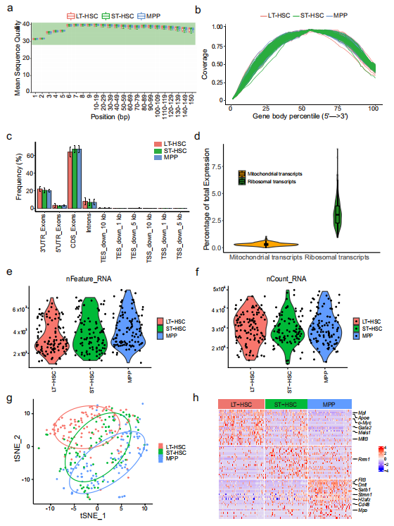 對(duì)于單細(xì)胞測序數(shù)據(jù),還檢查了映射到線粒體和核糖體基因的reads的比例(圖2d)。每個(gè)細(xì)胞的線粒體基因和細(xì)胞核糖體基因的中位數(shù)百分比為0.29和3.04。MPP檢測到的基因數(shù)*高(圖2e),顯著高于LT-HSC,而每個(gè)細(xì)胞的UMI數(shù)在三種細(xì)胞類型之間具有相似性(圖2f)。UMAP圖表明ST-HSC位于LT-HSC和MPP之間(圖2g)。接下來分析細(xì)胞類型之間的差異表達(dá)基因。LT-HSC、ST-HSC和MPP中分別有62、63和266個(gè)差異表達(dá)基因。此外一些已知的HSC特征基因,包括Mpl、c-Myc、Mllt3、Gata2,在LT-HSC中表達(dá)顯著增高(圖2h)。