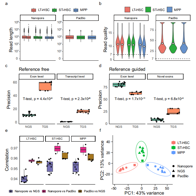 為了評(píng)估重復(fù)之間的一致性,計(jì)算了短讀長和長讀長測序之間的基因定量的相關(guān)性。相關(guān)系數(shù)均在0.93以上(圖4e),表明重復(fù)樣本間具有較高的一致性。此外,PCA顯示短讀長和長讀長測序數(shù)據(jù)按細(xì)胞類型進(jìn)行了聚類(圖4f)。結(jié)果表明,長讀長測序數(shù)據(jù)質(zhì)量高,生物重復(fù)一致性高。此外,長讀長測序能夠?qū)π碌耐怙@子和轉(zhuǎn)錄本進(jìn)行識(shí)別和定量。