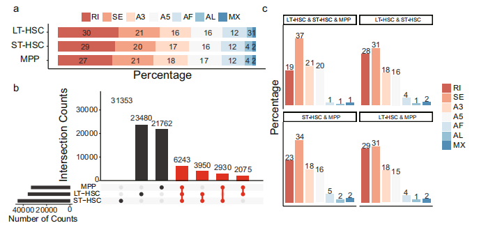 利用短讀長下一代測序(NGS)或長讀長測序(如PacBio和Oxford Nanopore Technologies)的RNA測序,是解讀包括血細(xì)胞生成在內(nèi)的各種生物過程中的轉(zhuǎn)錄多樣性和調(diào)控機(jī)制的強(qiáng)大工具。雖然NGS在表達(dá)定量方面更可靠,但是短讀長在AS事件中只能提供有限的信息。相比之下,長讀長的測序方法提供了一個(gè)獨(dú)特的機(jī)會(huì),可以實(shí)現(xiàn)在提供全長信息的基礎(chǔ)上檢測可變剪接異構(gòu)體。本文使用短讀長和長讀長RNA測序,在批量和單細(xì)胞水平上對(duì)小鼠HSC和MPP進(jìn)行了全面的轉(zhuǎn)錄圖譜分析。