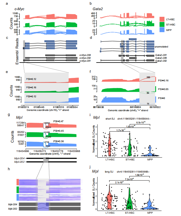 為了進(jìn)一步確認(rèn)長讀長在識(shí)別可變剪接異構(gòu)體方面的優(yōu)勢,使用納米孔和PacBio測序數(shù)據(jù)對(duì)三種細(xì)胞類型中已知的LT-HSC的標(biāo)志物c-Myc和Gata2(圖2h)的轉(zhuǎn)錄本進(jìn)行了可視化。接下來篩選了所有映射到基因c-Myc和Gata2及其注釋的轉(zhuǎn)錄本上的reads。發(fā)現(xiàn)2915個(gè)reads覆蓋到了c-Myc,且LT-HSC的reads數(shù)*多(圖6a)。在納米孔和PacBio測序數(shù)據(jù)中可視化了全長轉(zhuǎn)錄本的reads,發(fā)現(xiàn)所有注釋的亞型都能被鑒定識(shí)別(圖6c)。在c-Myc第一個(gè)外顯子中發(fā)現(xiàn)了一個(gè)5 ‘的可變剪接起始位點(diǎn)。使用短讀長測序數(shù)據(jù)來定量該基因座的剪接百分比(PSI),發(fā)現(xiàn)較長的異構(gòu)體在所有三種細(xì)胞類型中具有相似的 PSI(剪接百分比),ST-HSC中包含第一個(gè)外顯子的較長異構(gòu)體的reads占比比較高(圖6 e)。對(duì)于Gata2來說,發(fā)現(xiàn)覆蓋有595個(gè)reads,在LT-HSC中比其他兩種細(xì)胞類型多了近20倍的reads數(shù)(圖6b)。通過對(duì)比全長reads和注釋的轉(zhuǎn)錄本,發(fā)現(xiàn)在LT-HSC中Ensembl的轉(zhuǎn)錄本中有一個(gè)未注釋的內(nèi)含子保留(圖6d)。隨后利用短讀長測序數(shù)據(jù)驗(yàn)證驗(yàn)證了這種內(nèi)含子保留并定量這個(gè)內(nèi)含子的PSI值,發(fā)現(xiàn)該內(nèi)含子在LT-HSC中PSI值*高(圖6f)。接下來展示將長讀長測序與單細(xì)胞RNA-seq結(jié)合的數(shù)據(jù)示例,從長讀長測序數(shù)據(jù)中鑒定到了一個(gè)在Mpl中具有24 bp可變剪接區(qū)域的可5’剪接位點(diǎn)(A5)。基于Smart-seq2的測序數(shù)據(jù)發(fā)現(xiàn)這個(gè)剪接事件在不同細(xì)胞類型中是差異的,其PSI值從LT-HSC,ST-HSC到MPP是依次遞減的(圖6g-j)。使用Smart-seq2數(shù)據(jù)可以觀察到單個(gè)細(xì)胞間的異質(zhì)性(圖6h),在造血過程中,所涉及的長和短剪接位點(diǎn)(SJ)是被顯著下調(diào)的(圖6i,j)。這些結(jié)果表明,整合短讀長和長讀長測序有助于識(shí)別差異表達(dá)的異構(gòu)體。