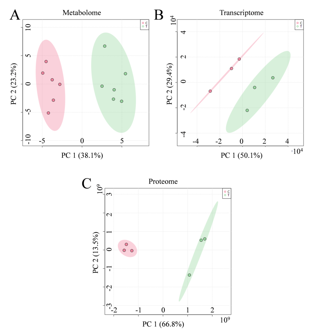 圖1?代謝組(a)、轉錄組(b)和蛋白質組(c)的主成分分析