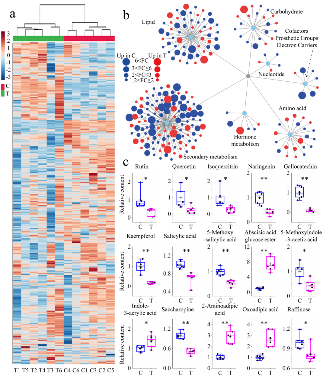 圖2四環素改變了代謝組,特別是次生代謝和脂質代謝。a、代謝物的熱圖譜聚類,顯示代謝物的相對含量。b、差異代謝物根據其功能/通路的綜合性進行聚類。?圓的大小與折疊變化(FC)值成正比。?紅色表示在四環素中有更高的FC?(T),而藍色表示在對照中有更高的FC?(C)。c、受四環素影響的代謝途徑相關代謝物的箱式圖。?*在P?<?0.05時差異顯著,**在P?<?0.01時差異顯著。