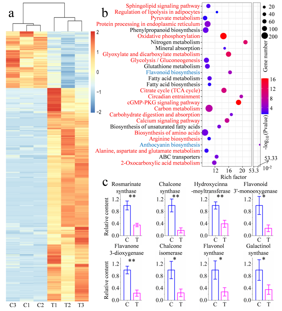 圖3?四環素改變轉錄組。a、差異轉錄本的熱圖聚類。b、差異轉錄本的KEGG。?圓越大,差異就越大。因子越高,富集程度越大。?紅色表示T中KEGG表達上調,藍色表示T中KEGG表達下調(P?<?0.05,上調或下調80%以上)。c、受四環素影響的代謝途徑相關轉錄本的例子。