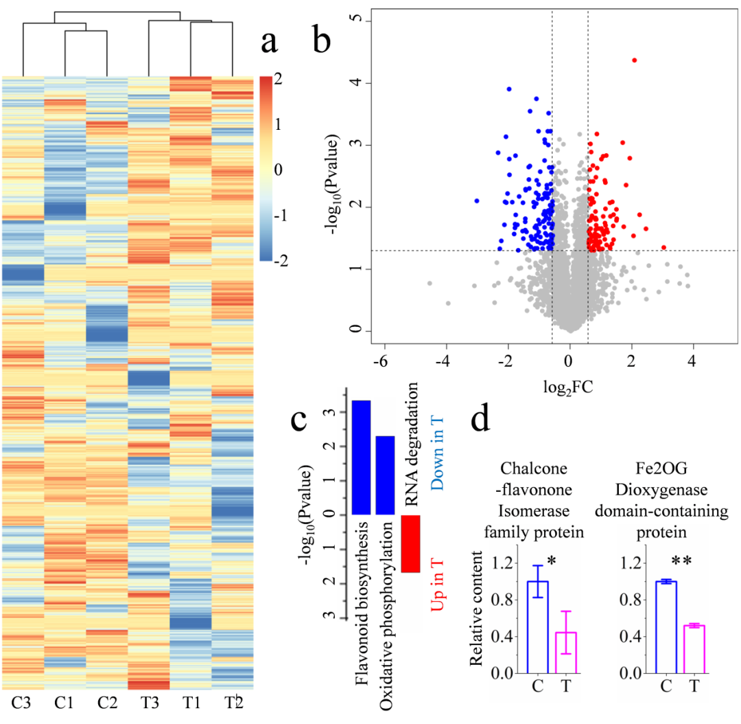 與對照組相比,在四環素處理下有273種蛋白質發生了顯著變化(P<?0.05)。KEGG富集分析發現,這些差異蛋白與類黃酮生物合成、氧化磷酸化、RNA降解、植物晝夜節律和α?-亞麻酸代謝相關。最顯著的是,在四環素脅迫下,與RNA降解相關的蛋白顯著增加(P?<?0.05,增加80%以上)。黃酮類化合物的生物合成和氧化磷酸化顯著減少(P?<?0.05,下降80%以上)。與轉錄組結果一致,黃酮類化合物的生物合成通路也是顯著降低。