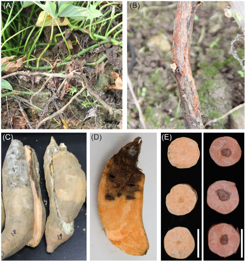 圖 1 大田感染 FRST 的甘薯植株表型。 (A)受感染的莖和葉。(B)覆蓋基部莖的帶紅色外皮。(C和D)受感染的貯藏根。(E)在致病性測試中接種 CRI 24-3 (右) 和陰性對照 (左) 的貯藏根。標(biāo)尺 = 5 厘米。