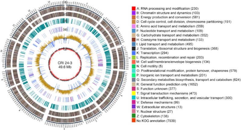圖 3 CRI 24-3 基因組組裝圈圖。 (A) 12 個contigs的物理位置。標(biāo)尺?= 1 kb。(B 和 C)具有 KOG 類的正向和反向鏈上的蛋白質(zhì)編碼基因。(D)?重復(fù)序列。(E)?正向鏈上的 tRNA(藍(lán)色)和 rRNA(紫色)編碼基因。(F)?某些區(qū)域的 GC 含量高于(黃色)或低于(藍(lán)色)平均基因組 GC 含量。(G) GC-skew = (G?C)/(G+C),具有正(黑色)或負(fù)(紅色)值。