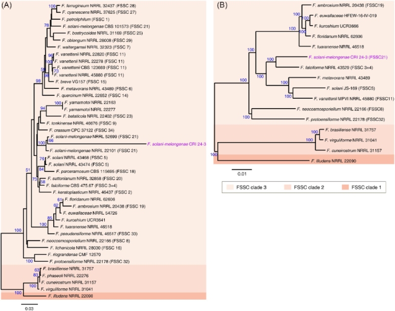 使用 BLASTn 工具與 NCBI 數(shù)據(jù)庫的比對表明,從 CRI 24-3 基因組 DNA 擴(kuò)增的 ITS 序列 PCR 與F. solani-melongenae?NRRL 22101 具有 99.8% 的同一性,具有 100% 的查詢覆蓋率(未發(fā)表的數(shù)據(jù)),表明 CRI 24-3 是 FSSC 的成員。為了更準(zhǔn)確地識別 CRI 24-3,進(jìn)行了基于ITS、RPB2和TEF 1-α的串聯(lián)序列的信息系統(tǒng)發(fā)育分析(圖 4A)。組合序列樹中的大多數(shù)引導(dǎo)值高于 ITS 樹(未發(fā)布數(shù)據(jù))中的值。三基因座樹顯示了一個優(yōu)勢分支,包括 FSSC 進(jìn)化枝 3 內(nèi)的 38 個群內(nèi)末端,F(xiàn)SSC 進(jìn)化枝 1 和 2 內(nèi)的分類群形成了一個基礎(chǔ)姊妹群(圖 4A和表 S2)。由 FSSC 分類群形成的主要分支被分成一個末端節(jié)點(diǎn),包括 CRI 24-3 和另一個包含F. protoensiforme?(FSSC 32) 和F. riograndense的亞基底節(jié)點(diǎn)。重要的是,CRI 24-3 與F. solani-melongenae密切相關(guān),并聚集在 FSSC 進(jìn)化枝 3 中。因此,F(xiàn)RST 的分離株 CRI 24-3 被鑒定為F. solani-melongenae?(FSSC 21) ,此方法是基于 Nilsson 等人提出的方法。