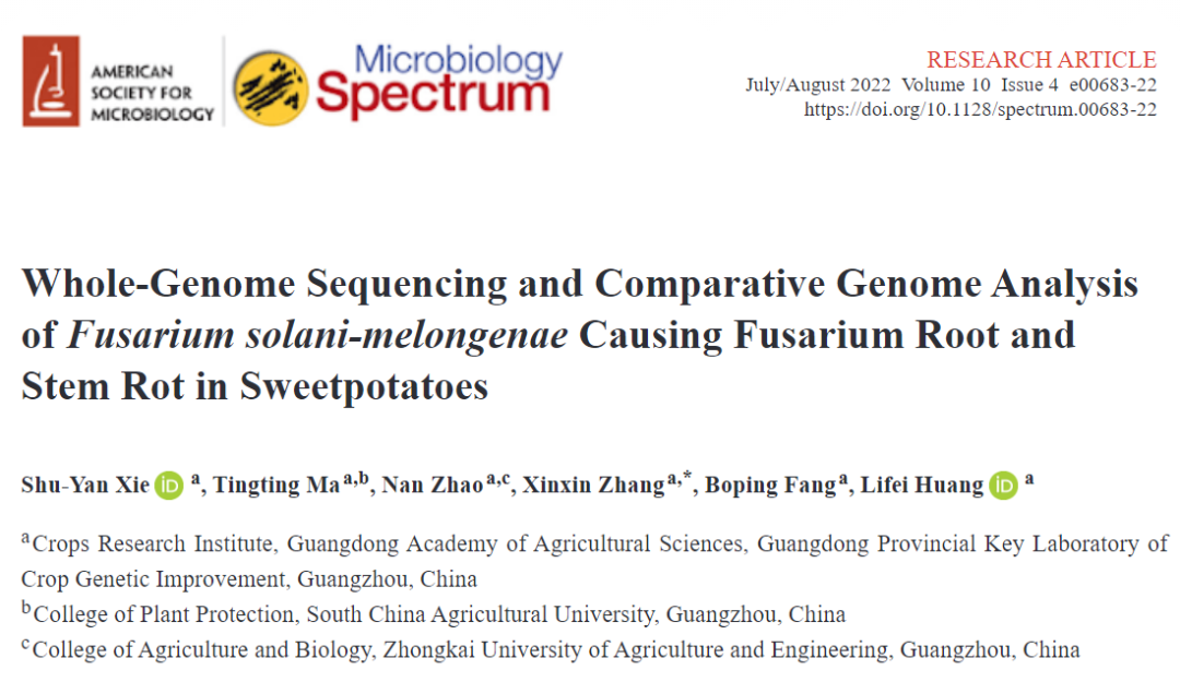 近日, Microbiology Spectrum(IF 9.0431)在線發(fā)表了廣東省農(nóng)科院作物所黃立飛副研究員、房伯平研究員為通訊作者的研究論文 “Whole-Genome Sequencing and Comparative Genome Analysis of?Fusarium solani-melongenae?Causing Fusarium Root and Stem Rot in Sweetpotatoes”,該研究報道了F. solani-melongenae?分離株 CRI 24-3 的全基因組組裝序列,并且深入探討其功能基因信息,為其他密切相關(guān)的鐮刀菌屬物種的基因組研究提供基礎(chǔ),通過比較基因組分析促進(jìn)了對鐮刀菌基因組特征和進(jìn)化關(guān)系的整體理解。百邁客有幸參與此項研究工作,對該真菌全基因組進(jìn)行測序組裝注釋和比較基因組分析。摘要