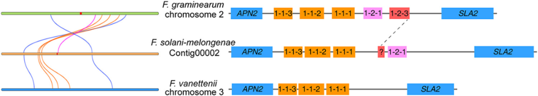 其他三種密切相關(guān)的 FSSC 物種F. falciforme、F. solani和F. vanettenii的基因組被用作參考基因組來探索 CRI 24-3 的選擇壓力。分別確定了 CRI 24-3 與?F. falciforme、F. solani?和F. vanettenii?之間的 2265、2272 和 2272 直系同源物對的非同義替換率 (Ka) 與同義替換率 (Ks) 的比率( 圖 6C 至 E)。Ka /Ks總體分析的值小于 1,表明 CRI 24-3 中的大多數(shù)直系同源物似乎都經(jīng)過了純化選擇并且高度保守。然而,CRI 24-3 和F. falciforme基因組的比較確定了一個快速進(jìn)化基因?qū)Γ‥VM0014458.1 與 GE10416_g)的 Ka /Ks比率大于 1,表明陽性選擇可能發(fā)生在進(jìn)化。基因組共線性分析表明,F. vanettenii和F. oxysporum基因組中的幾個染色體片段在 CRI 24-3 中濃縮成一個片段,并有一些倒位(圖 6F )。此外,CRI 24-3 中的一些直系同源物具有多對一的關(guān)系。CRI 24-3 中至少有兩個查詢基因與參考物種中的相同直系同源物匹配。值得注意的是,CRI 24-3 的重要基因組區(qū)域不能與尖孢鐮刀菌基因組中的那些共線性耦合,由 35.9% 的共線性率(共線直系同源物對與所有直系同源物對的比率)支持,該比率低于CRI 24-3 和F. vanettenii?(77.6%)。結(jié)果表明,CRI 24-3在系統(tǒng)發(fā)育上與尖孢鐮刀菌相距較遠(yuǎn)。MAT基因座對于在鐮刀菌屬中產(chǎn)生子囊孢子至關(guān)重要。在此,交配型結(jié)構(gòu)組織 ( MAT ) 基因座在基于簡化的共線性分析比較了茄科鐮孢菌CRI 24-3、禾谷鐮刀菌PH-1 和F. vanettenii?77-13-4(圖 7)。與僅攜帶 MAT1-1 基因的?F. vanettenii?77-13-4相比, CRI 24-3 含有MAT1-1和MAT1-2獨(dú)特型基因,在單個MAT基因座處與禾谷鐮刀菌密切相關(guān),除了 CRI 24-3 是 MAT1-2-3 缺陷型。只有位于 CRI 24-3 中 MAT1-2-1 上游區(qū)域的沒有任何特征功能域的片段與禾谷鐮刀菌中的 MAT1-2-3 具有序列相似性。