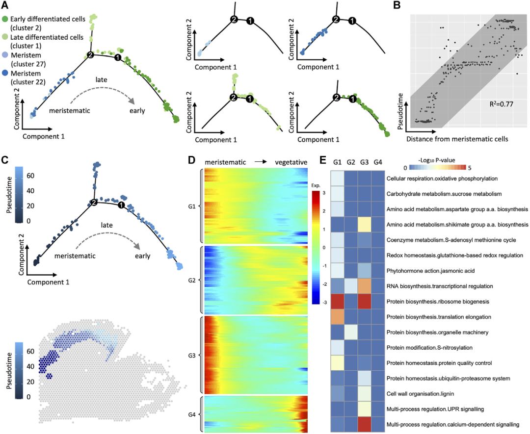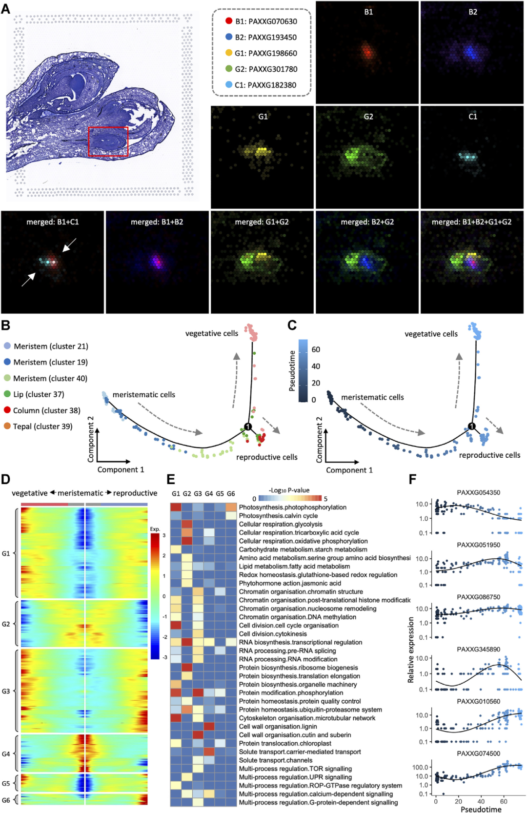 為了研究從分生組織細胞到營養型細胞(花被、唇瓣)和生殖細胞(花柱)的分化,研究團隊用Monocle繪制了細胞狀態的軌跡。如圖2B所示,三簇分生組織細胞形成了一條連續的路徑,代表其發育過程,與其在組織學切片上的位置高度一致。該路徑分為兩條子路徑:一條是由花被片中的營養型細胞組成,另一條由花柱中的花藥原基生殖細胞組成。細胞類型變化的軌跡作為動態發育過程的靜態投影,也可以理解為分生組織細胞的擬時序分化。如圖2C所示,此時營養型細胞出現較早,并分散在子路徑的遠端。共鑒定出4,685個空間差異基因與發育擬時間相關,對這些基因繪制分支軌跡基因表達熱圖,發現它們隨著發育路徑的分離表現出不同的表達模式(圖2D)。MapMan功能富集圖顯示它們主要富集在細胞壁代謝、激素、脂質、蛋白質和RNA合成等功能上(圖2E)。通過基因的擬時分布圖發現許多其他基因可能在分生組織、營養組織和生殖組織的細胞分化過程中發揮作用(圖2F)。