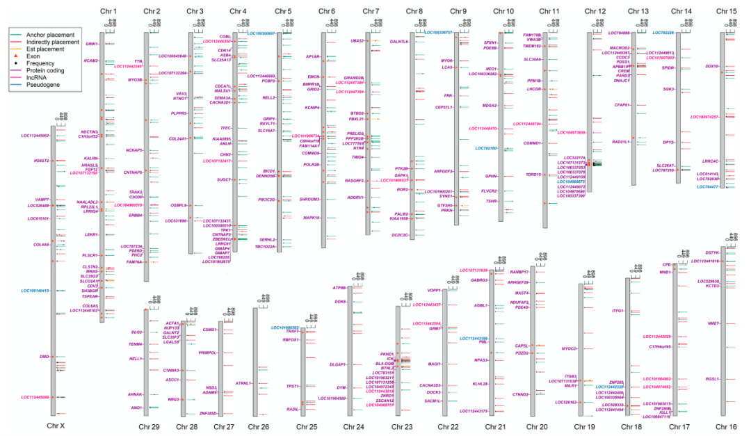 為解決以上問題,該文章通過開發新的基因組分析流程,對來自世界57個品種898頭牛的基因組序列進行組裝和SV檢測;發現了83Mb的牛基因組未知序列,相當于目前參考基因組序列總長度的3.1%,并且從中鑒定出大量未知外顯子序列,最后綜合三種策略成功將1007條contig放置在現有參考基因組上,這些序列可能通過外顯子破壞、外顯子添加等方式影響了279個基因的序列結構。