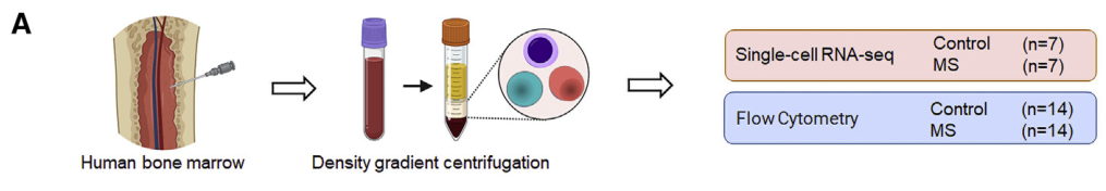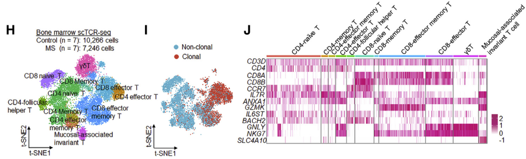 樣本設(shè)計:MS患者及健康對照各7例,取骨髓樣本,進(jìn)行scRNA-seq+scTCR-seq。