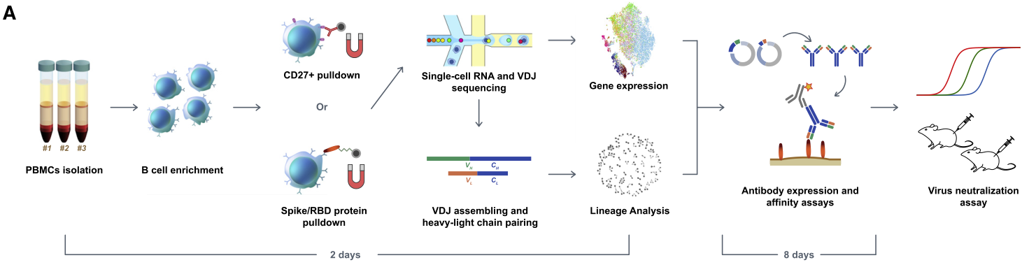 樣本設(shè)計:從12個COVID-19康復(fù)患者的外周血單核細(xì)胞PBMC中分離B細(xì)胞,對B細(xì)胞和CD27+記憶B細(xì)胞進(jìn)行scRNA-seq + scBCR-seq,獲得IgG1亞型抗體,并進(jìn)行抗體體外檢測和篩選。