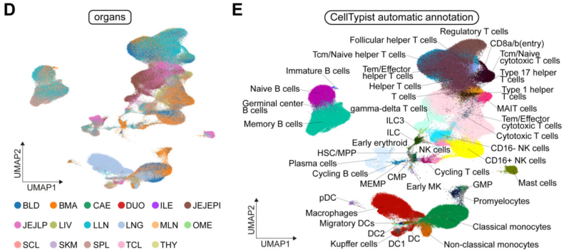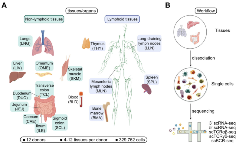 樣本設(shè)計:2個成人捐獻(xiàn)者的16份組織樣本,分別進(jìn)行scRNA、scTCR、scBCR,實驗中采集的組織樣本包括初級淋巴器官(骨髓)和次級淋巴器官(脾、肺引流和腸系膜淋巴結(jié))、粘膜組織(腸和肺)以及血液和肝臟等非淋巴組織,還包括胸腺、骨骼肌和網(wǎng)膜。