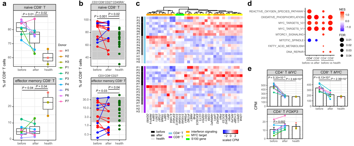 樣本設(shè)計:7名急性KD患者接受靜脈注射免疫球蛋白(IVIG)治療前、后,3例年齡匹配的健康對照,取新鮮外周血PBMC樣本,進(jìn)行scRNA+scTCR+scBCR測序。