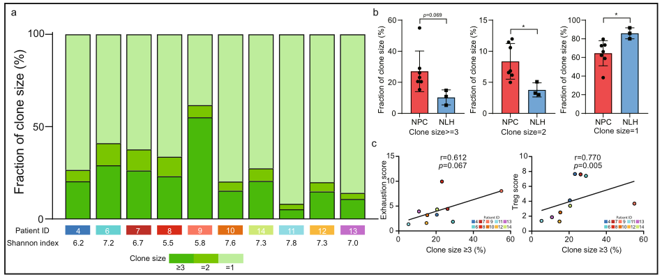 研究內(nèi)容:鼻咽癌的病理學(xué)特征表現(xiàn)為腫瘤內(nèi)部和附近經(jīng)常被成分復(fù)雜的免疫細(xì)胞所浸潤,這種微環(huán)境特征在理論上表明了免疫治療在鼻咽癌中具有極高的潛力。然而在I期和II期臨床試驗中,鼻咽癌患者對免疫療法的反應(yīng)率僅有 20%-30%,表明鼻咽癌微環(huán)境中細(xì)胞異質(zhì)性和動態(tài)功能需要進(jìn)一步精準(zhǔn)解析,從而優(yōu)化針對鼻咽癌的精準(zhǔn)治療。本研究利用單細(xì)胞免疫組庫技術(shù)系統(tǒng)地對比了鼻咽癌腫瘤微環(huán)境和非惡性鼻咽微環(huán)境的構(gòu)成和功能狀態(tài),發(fā)現(xiàn)初始B細(xì)胞、記憶性B細(xì)胞和效應(yīng)B細(xì)胞和鼻咽癌患者的預(yù)后呈顯著正相關(guān),雙陰性B細(xì)胞則和鼻咽癌患者的預(yù)后呈顯著負(fù)相關(guān),成為預(yù)測鼻咽癌患者預(yù)后的潛在生物標(biāo)記物;耗竭T細(xì)胞高度表達(dá) CXCL13,可能是招募 CXCR5+?B細(xì)胞并促進(jìn)三級淋巴結(jié)構(gòu)形成的重要分子機(jī)制,可能是影響B(tài)細(xì)胞在鼻咽癌腫瘤微環(huán)境中浸潤程度的因素之一;該研究發(fā)現(xiàn)了與鼻咽癌患者預(yù)后相關(guān)的特征基因和細(xì)胞亞群,從而為研究鼻咽癌微環(huán)境中的分子機(jī)制和優(yōu)化鼻咽癌精準(zhǔn)治療提供了分子生物學(xué)上的依據(jù)。