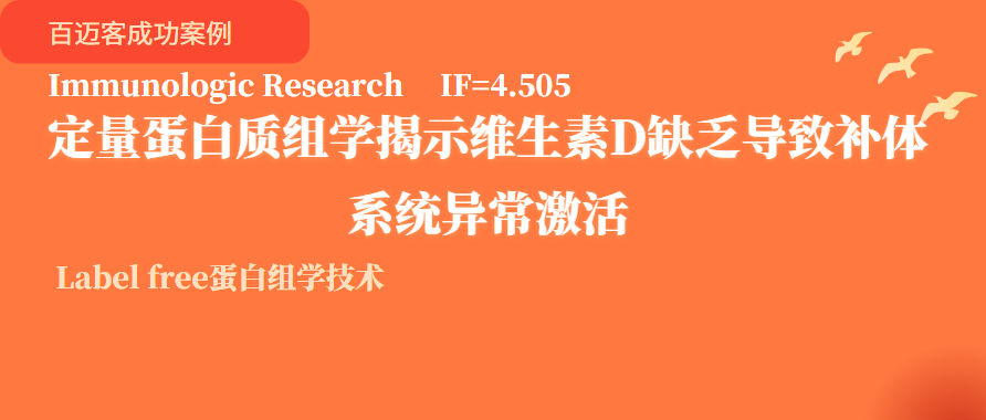 2022年9月30日,銀川市第一人民醫院謝曉敏教授團隊在《Immunologic Research》發表題為“Vitamin D deficiency leads to the abnormal activation of the complement system”的研究論文,該研究運用Laber free蛋白質組學技術在疾病研究中的應用,分析了不同維生素D水平下補體系統蛋白質表達的變化,發現了維生素D缺乏不僅會導致胰島素抵抗和糖代謝紊亂,還會導致蛋白質表達異常,從而導致補體系統的異常激活。為進一步研究維生素D與免疫系統的關系提供了新的理論基礎。百邁客生物為該研究提供了蛋白組檢測服務與部分分析工作。