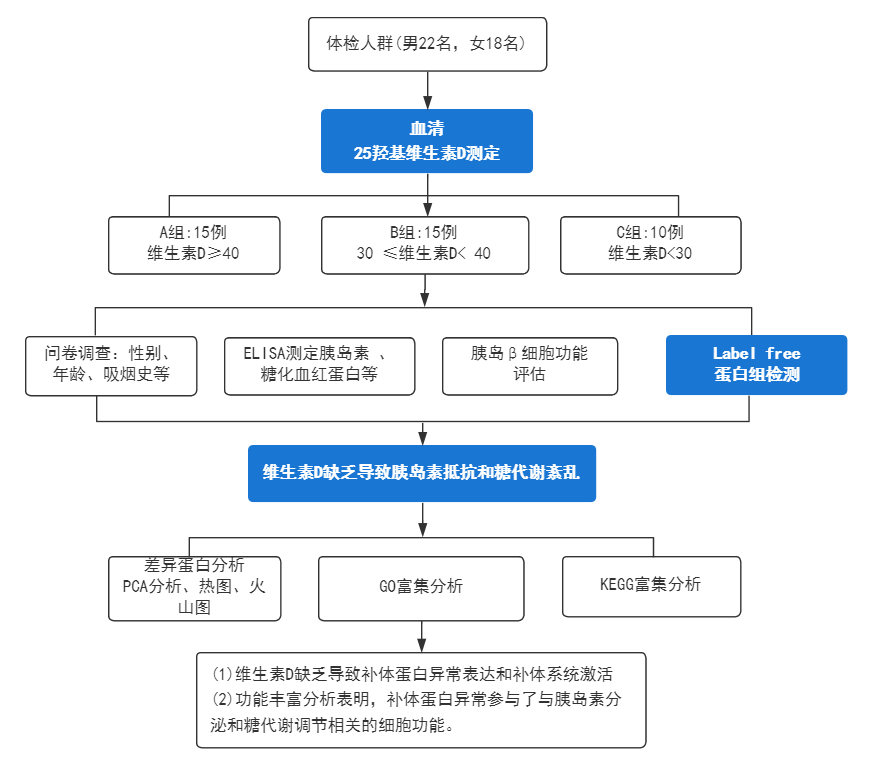 在該研究中,作者應用高通量非靶向蛋白質組學技術,根據維生素D水平,對不同空腹血糖狀態下的體檢人群進行分組,探討維生素D缺乏對人體補體系統激活的可能機制。為蛋白質組學在疾病研究中的應用提供了一個很好的案例。