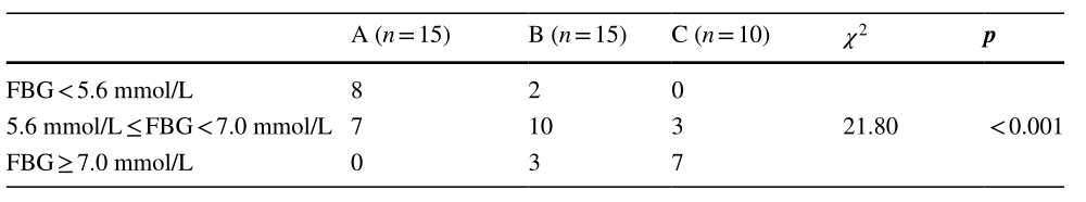 樣本:體檢人群,男22例,女18例。其中空腹血糖<5.6mmog/L組,5.6mmog/L~6.1 mmol/L組10例,≥7.0mmoL/L組10例。