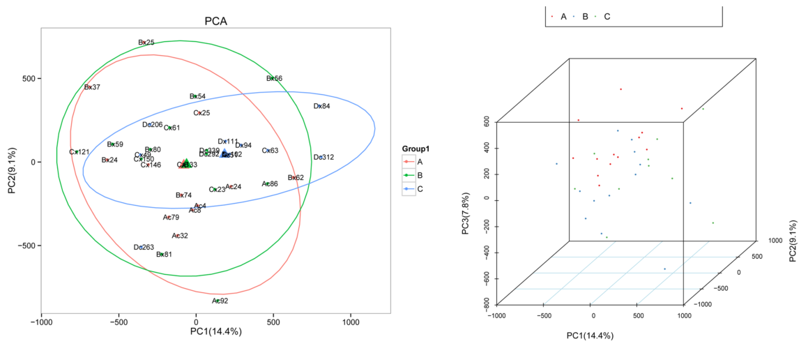 對三組蛋白質樣本進行了PCA分析(圖1)。蛋白質組差異分析用于分析維生素缺乏對補體差異蛋白的影響。如火山圖(A?vs B)所示,隨著維生素D含量的降低,7種蛋白質的表達水平上調,7種蛋白質的表達水平下調(圖2A),如補體因子B(CFB)、原肌球蛋白α-4鏈(TPM4)和可誘導共刺激分子配體(ICOSL)。A組和B組熱圖分析結果顯示兩組之間有很好的分離(圖2B)。