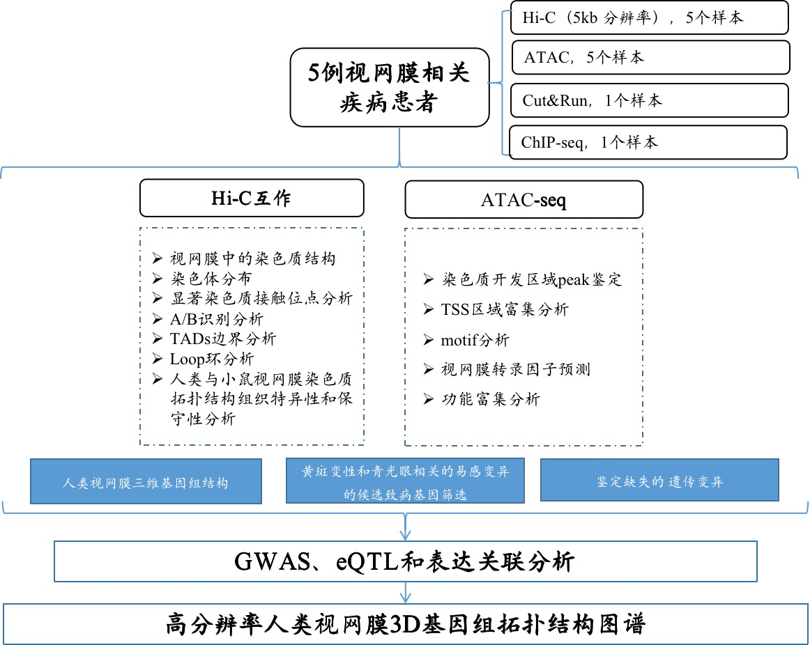 材料:一共取材5名患者捐贈(zèng)視網(wǎng)膜組織(2名女性,3名男性,年齡65-77歲);Hi-C互作取3名男性和1名女性視網(wǎng)膜組織以及HCT116細(xì)胞系;CUT&RUN取1名75歲的女性外周視網(wǎng)膜組織;ATAC-seq取2名女性和3名男性視網(wǎng)膜組織。