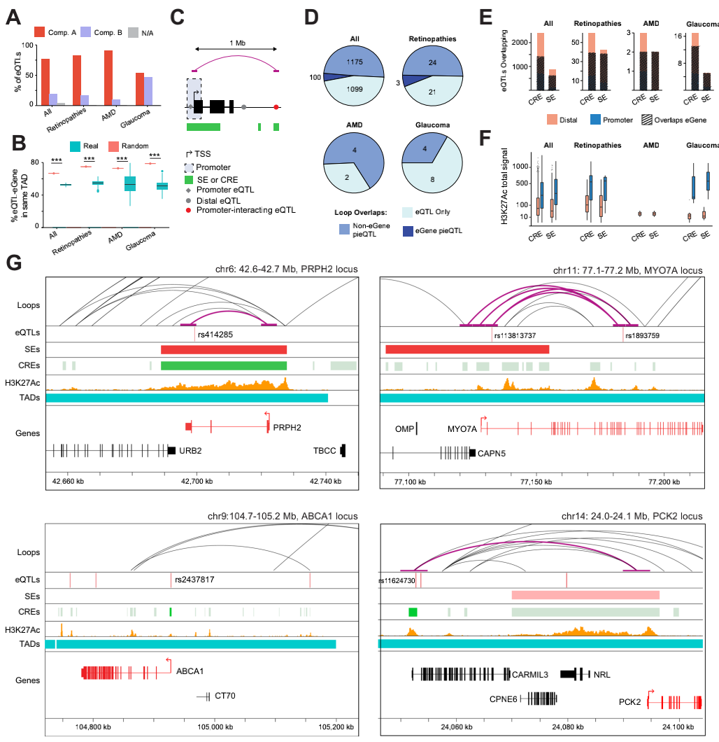 eQTL將特定的遺傳變異與目標(biāo)基因表達(dá)的變化聯(lián)系起來(下文稱為eGene),為了識(shí)別可能與視網(wǎng)膜基因調(diào)節(jié)相關(guān)的eQTL,結(jié)合14,859個(gè)視網(wǎng)膜eQTLs,發(fā)現(xiàn)大多數(shù)視網(wǎng)膜eQTL都存在于活躍的染色質(zhì)中,并駐留在同一個(gè)TAD中,這為解釋基因變體對(duì)eGene的影響提供了直接機(jī)制。此外,評(píng)估了變異與其eGene的啟動(dòng)子區(qū)域(距離TSS±2.5kb)之間的物理距離,能夠區(qū)分啟動(dòng)子eQTL、遠(yuǎn)端eQTL和與啟動(dòng)子相互作用的遠(yuǎn)端eQTL。分別確定了2,410個(gè)CRE(CRE-eQTL)和880個(gè)SE(SE-eQTL)特殊的eQTL,其中58.5%的CRE-eQTL和69.3%的SE-eQTL也與相關(guān)的eGene相交。總體而言,大多數(shù)eQTL在物理上與eGene或其啟動(dòng)子重疊或者通過染色質(zhì)loops互作接近各自的eGene。
