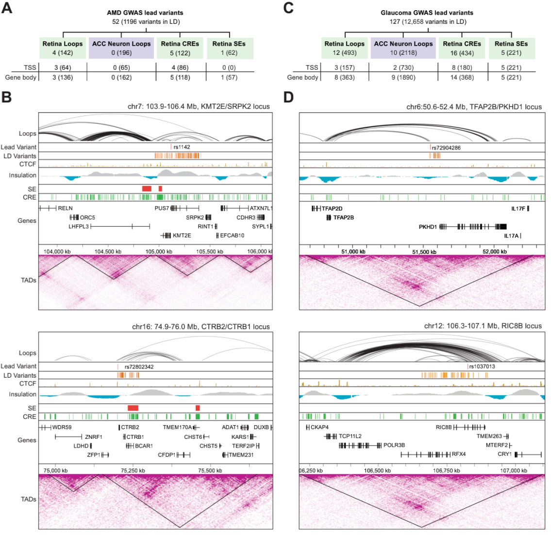 2)視網(wǎng)膜調(diào)控基因組拓?fù)浣Y(jié)構(gòu)與AMD和青光眼相關(guān)遺傳變異的首次詳細(xì)整合;