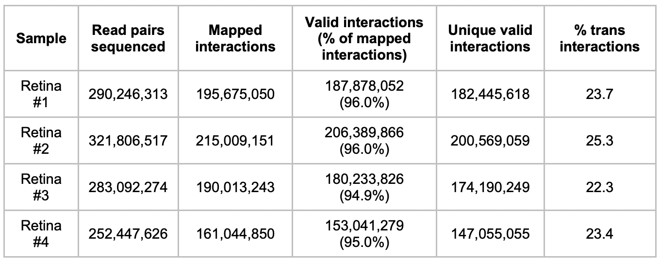 利用Hi-C技術(shù)檢測(cè)了4名眼科相關(guān)疾病患者的視網(wǎng)膜組織,以超高的分辨率(5kb)的重新繪制了人類視網(wǎng)膜細(xì)胞染色質(zhì)的組織(每個(gè)視網(wǎng)膜樣本的測(cè)序深度約為3億對(duì)reads,HCT116的深度約為5000萬對(duì)read)。分析表明Hi-C數(shù)據(jù)在樣本間表現(xiàn)出高度的相似性,所有常染色體的分層相關(guān)系數(shù)(SCC)>0.97。整合所有樣本的數(shù)據(jù)一共獲得了11.48億對(duì)reads,其中有效互作reads的比例高達(dá)95%,不同染色體之間的互作trans占23.6%。