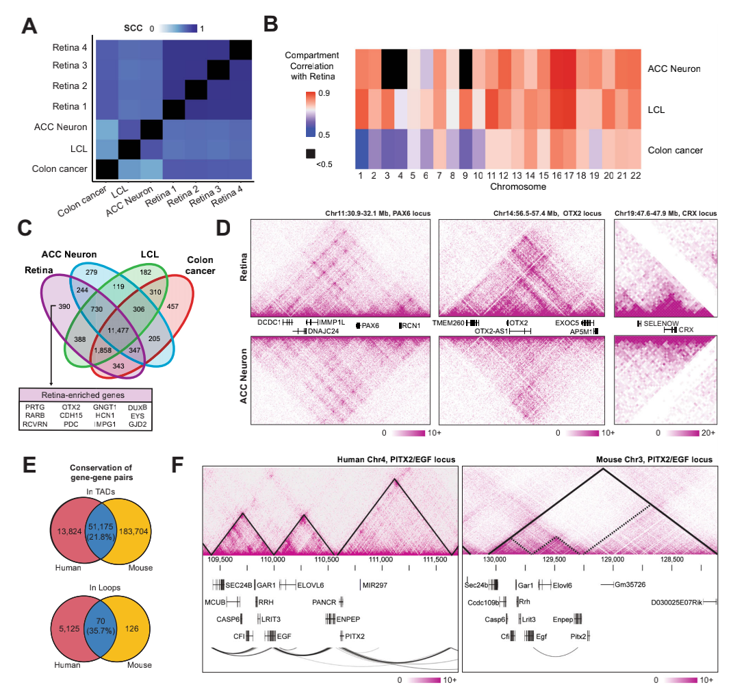 為了評(píng)估已識(shí)別的染色質(zhì)特征在人視網(wǎng)膜組織特異性和物種保守性,這里比較了人類神經(jīng)元(ACC)、GM12878淋巴細(xì)胞(LCL)、結(jié)腸癌細(xì)胞(HCT116,clone cancer)Hi-C測(cè)序數(shù)據(jù),發(fā)現(xiàn)視網(wǎng)膜特異性基因,如OTX2、EYS、PDC,只存在于視網(wǎng)膜的A component;由于視網(wǎng)膜和ACC神經(jīng)元之間的高度相關(guān)性,比較發(fā)現(xiàn)PAX6基因座在神經(jīng)元和視網(wǎng)膜中的相互作用與其在兩個(gè)組織中的表達(dá)相似,而編碼OTX2和CRX兩個(gè)關(guān)鍵的視網(wǎng)膜TF,在視網(wǎng)膜中表現(xiàn)出大量的局部相互作用,但在神經(jīng)元中沒有,表明人視網(wǎng)膜組織拓?fù)潢P(guān)聯(lián)域具有組織特異性,并在基因調(diào)節(jié)中發(fā)揮著重要作用。