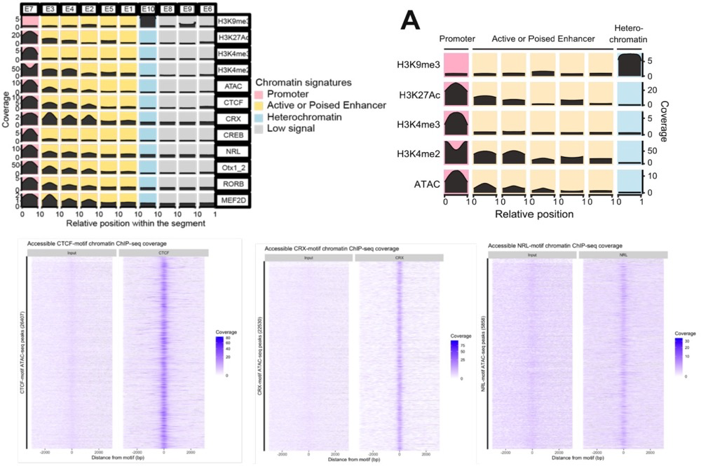 染色質(zhì)互作形成的loops促進(jìn)CRE與其目標(biāo)基因之間的物理相互作用,并且在控制基因表達(dá)方面發(fā)揮著至關(guān)重要的作用。為了識(shí)別視網(wǎng)膜CRE,利用染色質(zhì)可及性檢測(cè)(ATAC-seq)確定了染色質(zhì)開放狀態(tài)和CUT&Run檢測(cè)活性(H3K4me3,H3K27Ac,H3K4me234)和抑制性(H3K9me3)組蛋白標(biāo)記互作的特征序列。通過全基因組染色質(zhì)開放程度以及開放區(qū)域(啟動(dòng)子、增強(qiáng)子、異染色質(zhì)、低豐度信號(hào))構(gòu)建了10種染色質(zhì)狀態(tài)模型,啟動(dòng)子和增強(qiáng)子區(qū)域富集了用于結(jié)合CTCF和關(guān)鍵視網(wǎng)膜TF,如CRX、NRL、OTX2、MEF2D、CREB和RORB,另外增強(qiáng)子主要在TSS上游區(qū)域富集,而啟動(dòng)子僅在TSS富集。