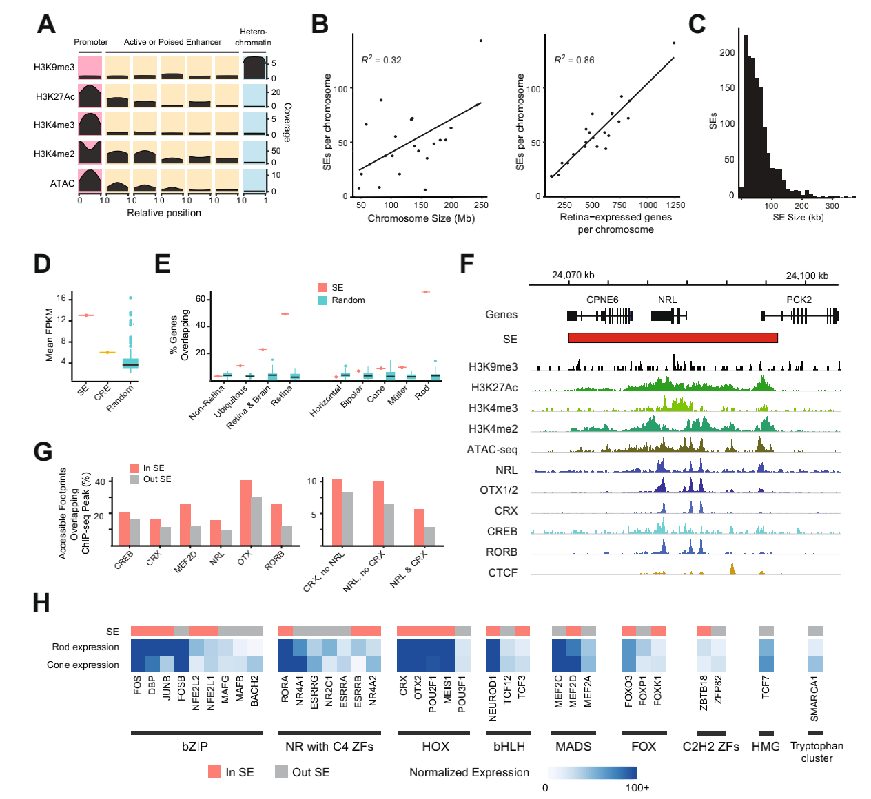 利用H3K27Ac蛋白標(biāo)記互作在視網(wǎng)膜順式調(diào)控元件啟動(dòng)子和活性或穩(wěn)定增強(qiáng)子區(qū)域鑒定了1325個(gè)超級(jí)增強(qiáng)子(SEs),發(fā)現(xiàn)視網(wǎng)膜表達(dá)基因的數(shù)量與每個(gè)染色體的SE數(shù)量之間存在高度相關(guān)性。SE與轉(zhuǎn)錄組測(cè)序數(shù)據(jù)集結(jié)合分析表明,與CRE相比,SE重疊的基因的平均表達(dá)量高2.17倍,并且比100組隨機(jī)SE大小的位點(diǎn)高2.89倍,視網(wǎng)膜中關(guān)鍵的光感受器特異性基因NRL主要在活性組蛋白標(biāo)記和染色質(zhì)開放區(qū)域的大型SE中富集,與CRE或隨機(jī)區(qū)域相比,TF結(jié)合位點(diǎn)主要存在于SE中,其中編碼許多具有豐富結(jié)合基序TF的基因也與SE重疊,這表明它們?cè)诰S持視網(wǎng)膜穩(wěn)態(tài)方面的潛在作用。