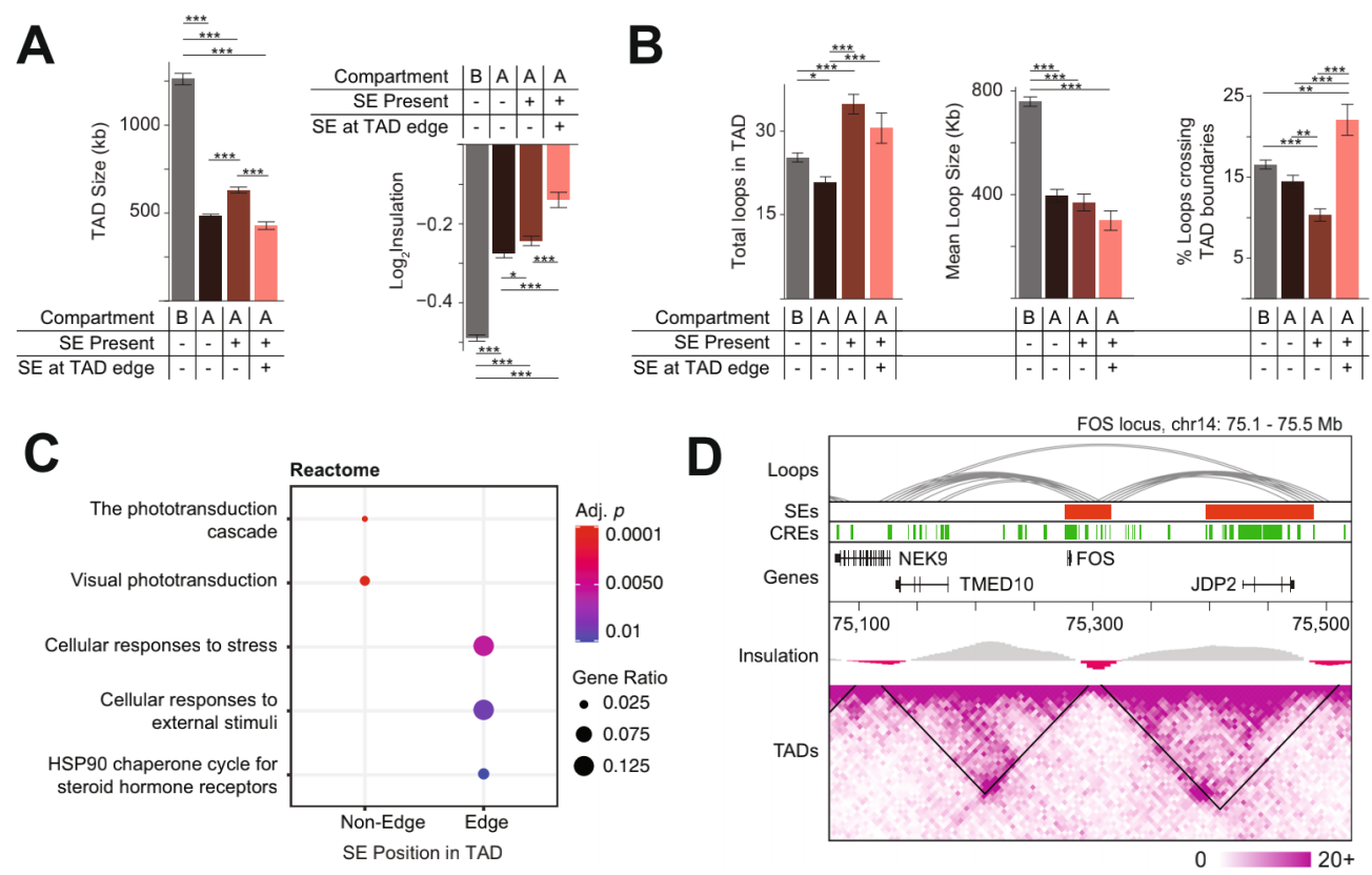 SE靶向基因功能研究,即TSS與SE重疊或相互作用的基因,發(fā)現(xiàn)SE處在邊緣的TAD中都是富含應(yīng)激反應(yīng)基因,而視網(wǎng)膜基因主要在SE處于中心的TAD中富集,其中應(yīng)激反應(yīng)FOS重疊的SE位于TAD的邊緣,該TAD可能會(huì)受到超出自身TAD邊界的區(qū)域變化的影響。