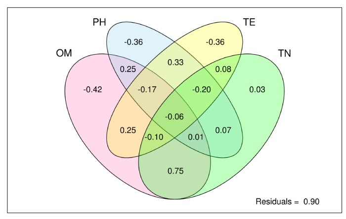 VPA分析(方差分解分析):VPA,全稱Variance Partitioning Analysis,中文稱為方差分解分析,該分析的目的是確定指定的環境因子對群落結構變化的解釋比例。通常在CCA/RDA的排序分析方法可以得到所有參與分析的環境因子對群落變化的解釋比例。使用R語言vegan包(version:2.3-0),varpart函數進行分析;分析前首先需要對環境因子進行一個分類,一般支持2-4類,默認使用大于等于2個環境因子進行此分析。