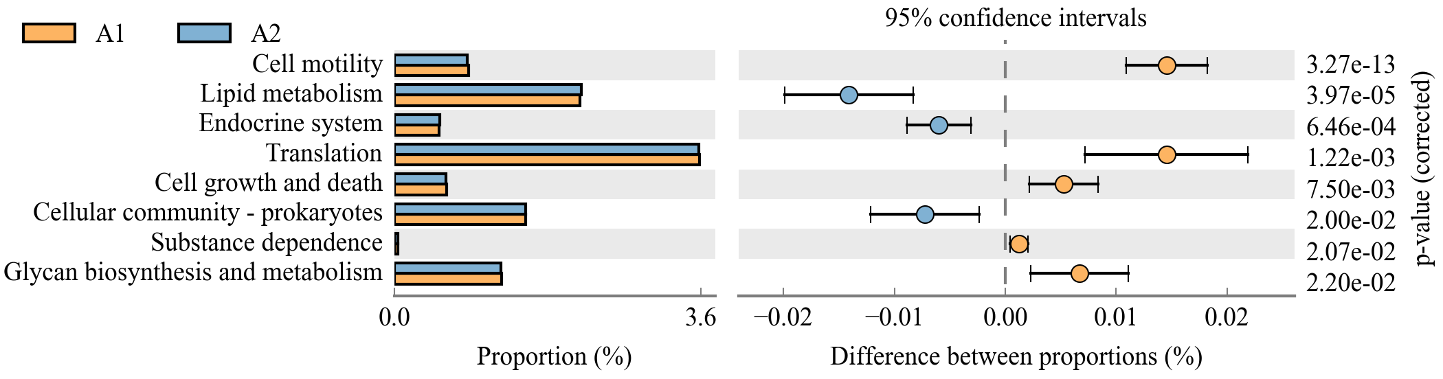 PICRUSt 2 將特征序列(16S rRNA)與微生物基因組數據庫(IMG,Integrated Microbial Genomes)參考序列對齊(aliign)構建進化樹,找到特征序列的“最近物種”,并根據已知物種的基因種類和豐度信息預測未知物種的基因信息,從而結合基因的KEGG通路信息預測整個群落的通路情況。通過組間差異分析,得到在組間具有顯著差異的功能,最后利用Stamp對結果進行差異可視化。