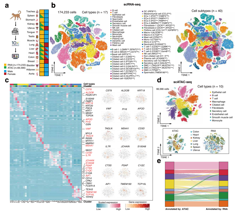 該研究對(duì)成年食蟹猴的16個(gè)代表性器官進(jìn)行單細(xì)胞轉(zhuǎn)錄組測(cè)序和單細(xì)胞染色質(zhì)開(kāi)放性測(cè)序,構(gòu)建了食蟹猴多器官的單細(xì)胞多組學(xué)參考圖譜,將25萬(wàn)個(gè)細(xì)胞進(jìn)行 t-SNE降維聚類得到40余種不同的細(xì)胞亞群。