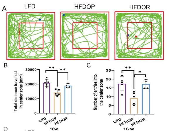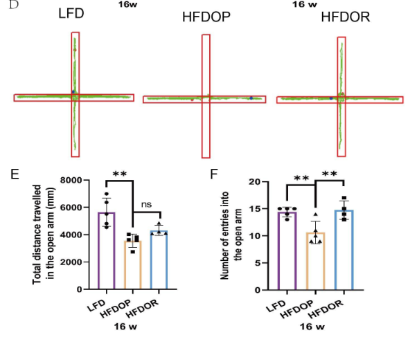 為了排除抑郁和焦慮樣行為對肥胖抵抗的影響,在16周結束時進行了自發開場活動實驗和高架十字迷宮實驗。開場實驗結果如圖2A-C所示。HFDOP組進入中心區域的次數和進入該區域的次數顯著低于LFD組(圖2B、C)。HFDOR 組比 HFDOP 組更遠地進入中心區域并且更頻繁地進入該區域(圖2B、C)。高架十字迷宮實驗表明,與LFD組相比,HFDOP組進入開臂的次數和頻率都要少得多(圖3E、F)。HFDOR組比HFDOP組開臂走得更遠,但兩組之間沒有統計學意義。HFDOR組比HFDOP組更頻繁地進入開臂(圖3F)。