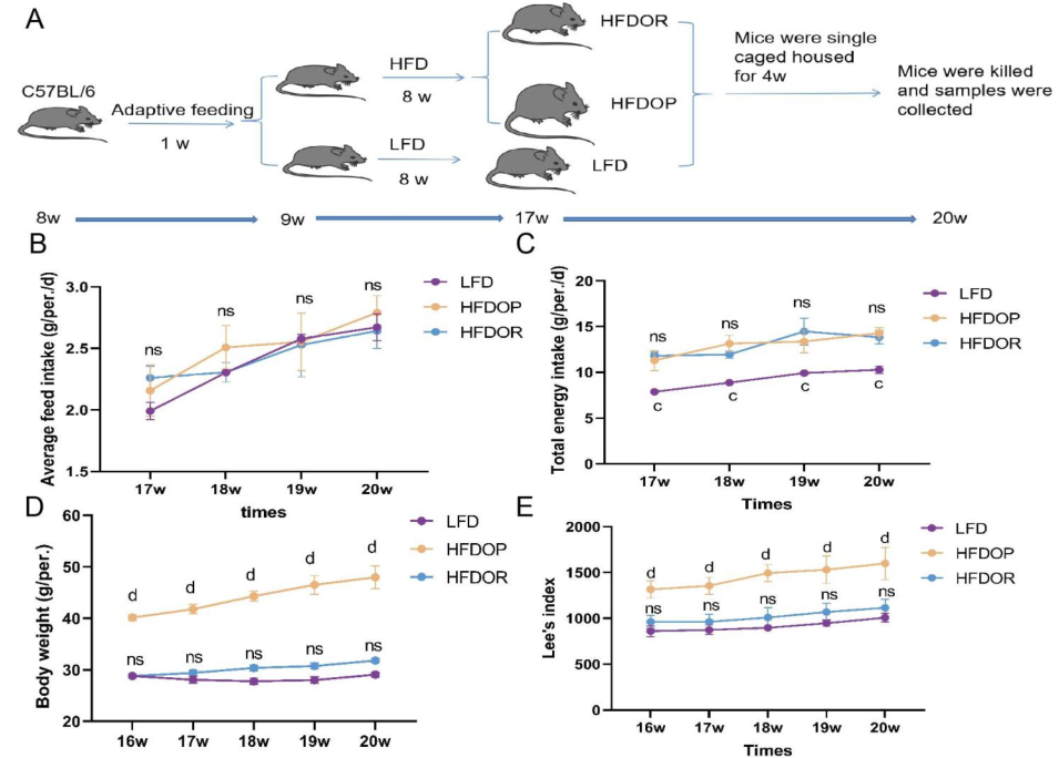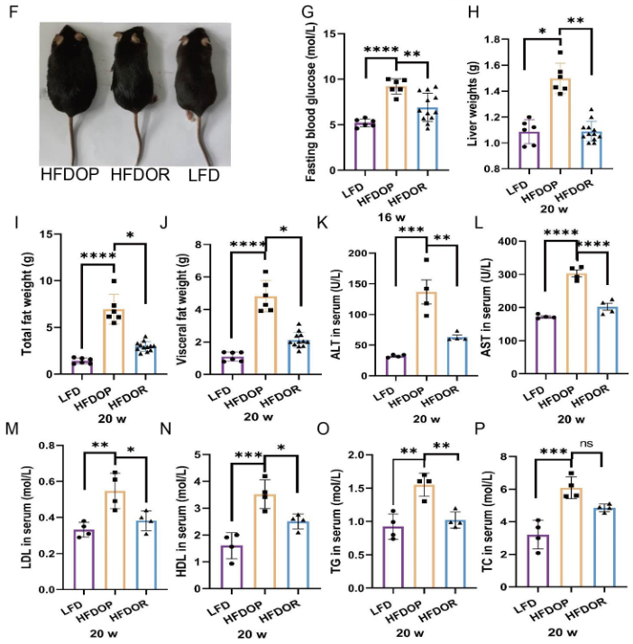 然而,HFDOR組的肝臟、總脂肪和總內臟脂肪的重量顯著低于HFDOP組(圖1H-J)。HFDOP組AST、ALT、HDL、LDL、TG和TC水平較LFD組顯著升高(圖3K-P)。然而,HFDOR組的AST、ALT、高密度脂蛋白、低密度脂蛋白和甘油三酯水平顯著低于HFDOP組(圖3K-O)。盡管HFDOR組的TC水平低于HFDOP組,但差異無統計學意義。