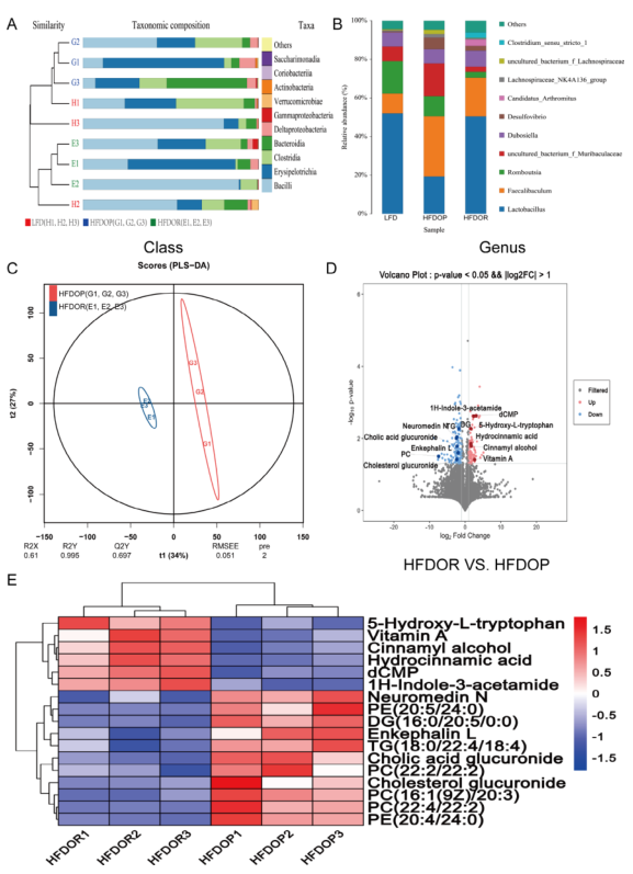 小腸內容物非靶向代謝組學的結果如圖3C-E 所示,PLS-DA 分析表明 HFDOR 和 HFDOP 組之間的明顯分離(圖3C)。在小腸內容物中共檢測到 314 種差異代謝物(圖3D)。相關性分析表明,Desulfovibrio、Bifidobacterium和Gemella都與 PC、DG 和膽酸葡糖苷酸呈正相關,而與維生素 A、dCMP、肉桂醇、5-HT 和肉桂酸葡糖苷酸呈負相關(圖3E)。Clostridium_sensu_stricto_1 和 Ralstonia 與維生素 A、dCMP、肉桂醇、5-HT、1 H-吲哚-3-乙酰胺和氫化肉桂酸呈正相關,與 PC、PE、TG、DG、neuromedin N、腦啡肽 L 和膽固醇葡糖苷酸呈負相關(圖 4)。