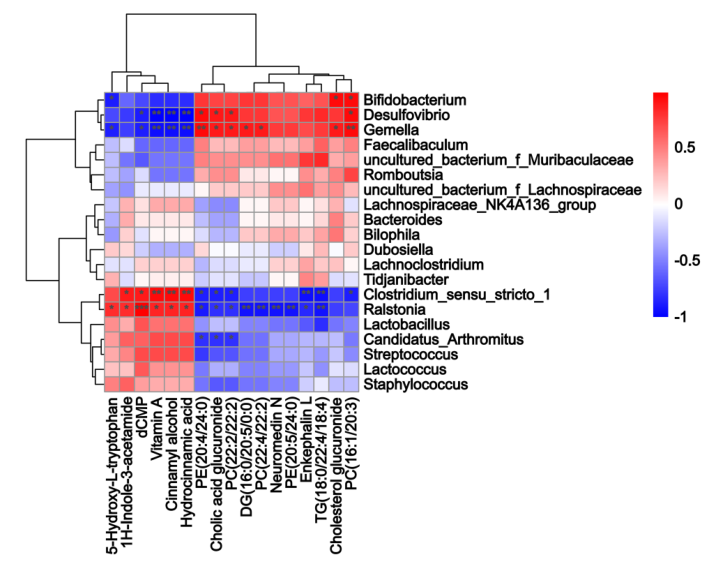 圖4. 小腸微生物群與代謝物的 Spearman 相關性分析