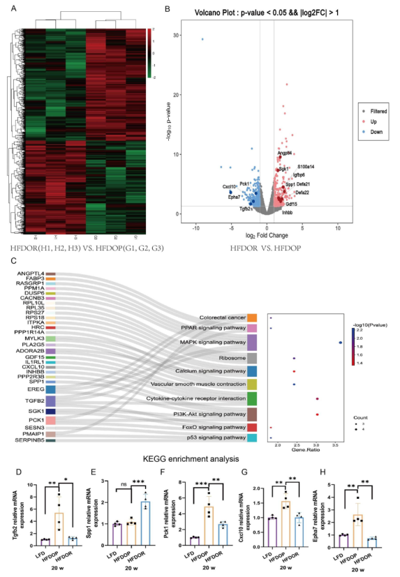 為了進一步探討肥胖/肥胖抵抗的原因,研究者運用全長轉錄組測序技術檢測空腸組織中的基因轉錄水平。共鑒定出1645個差異表達基因(750個上調,895個下調),其中331個差異表達顯著。在331個顯著差異表達基因中中,有30個基因在11條KEGG通路中被富集。富集的基因和10條最豐富的KEGG途徑如圖所示,這些基因在絲裂原活化蛋白激酶(MAPK)、細胞因子和磷脂酰肌醇3’激酶/蛋白激酶B(PI3K/Akt)信號通路中顯著豐富(圖6C)。用qPCR分別驗證了差異表達基因。Tgfb2、Spp1、Pck 1、Cxcl10和Epha7表現出一致的mRNA表達模式(圖6B,D-H)。
